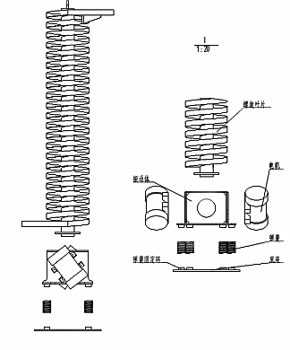 螺旋垂直提升機(jī)的驅(qū)動(dòng)裝置振動(dòng)電機(jī)安裝在輸送塔下部,兩臺(tái)振動(dòng)電機(jī)對(duì)稱交叉安裝,輸送塔由管體和焊接在管體周圍的螺旋輸送槽組成,輸送塔座于減振裝置上,減振裝置由底座和隔振彈簧組成。當(dāng)垂直提升機(jī)工作時(shí),根據(jù)雙振動(dòng)電機(jī)自同步原理,由振動(dòng)電機(jī)產(chǎn)生激振力,強(qiáng)迫整個(gè)輸送塔體作水平圓運(yùn)動(dòng)和向上垂直運(yùn)動(dòng)的空間復(fù)合振動(dòng),螺旋槽內(nèi)的物料則受輸送槽的作用,作勻速拋擲圓運(yùn)動(dòng),沿輸送槽體向上運(yùn)動(dòng),從而完成物料的向上(或向下)輸送作業(yè),因此本設(shè)備也被成為振動(dòng)垂直輸送機(jī)。